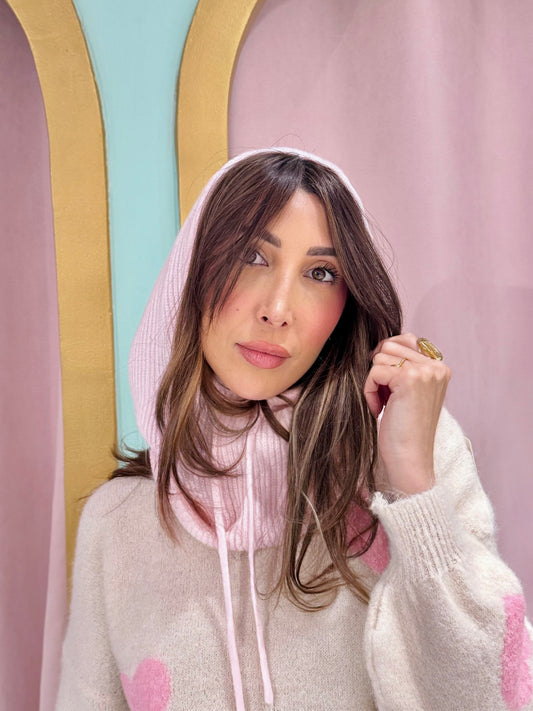 Cagoule capuche en maille rose pastel