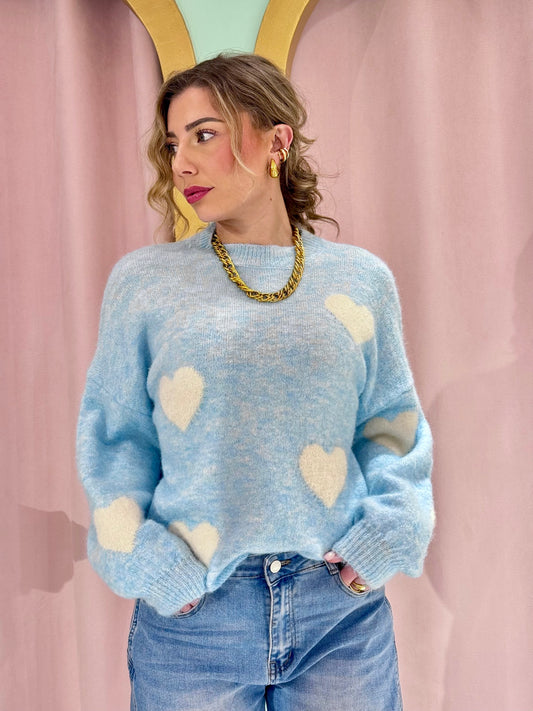 Pull doux à cœurs – bleu ciel