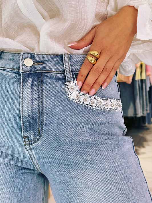 Jean wide leg perles & dentelle