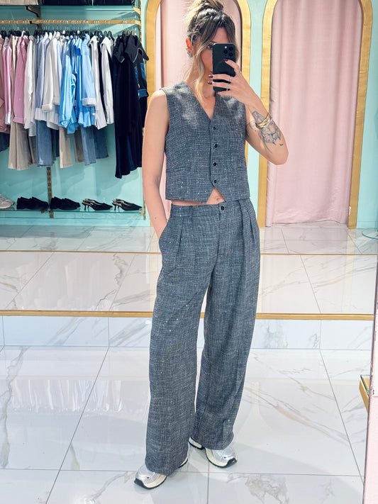 Pantalon tailleur oversized façon tweed avec sequins