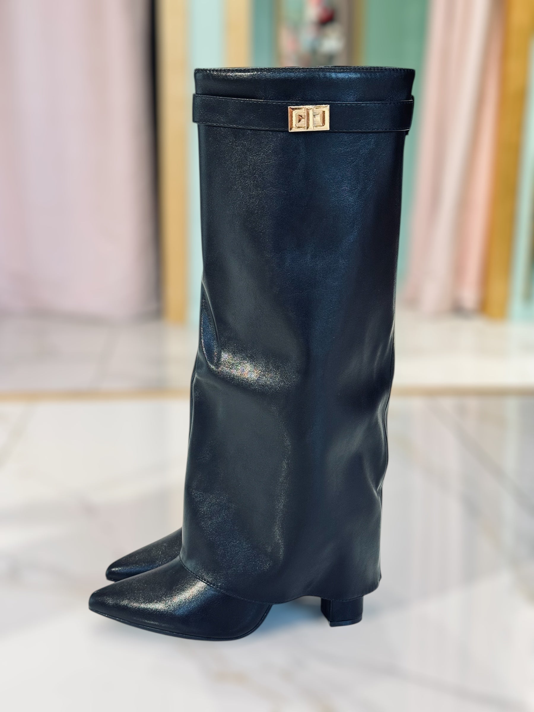 On aime particulièrement le détail de sangle avec boucle dorée sur le haut de la botte, qui apporte une touche chic et structurée sans en faire trop.