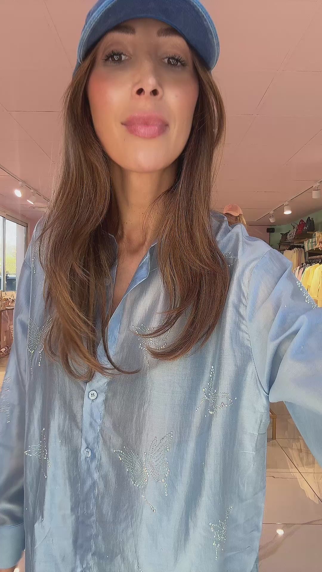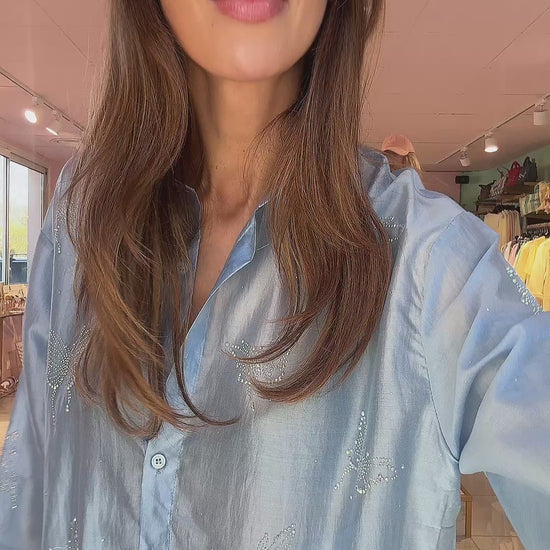 Un ensemble délicat et aérien qui joue avec la transparence, la fluidité et les détails subtils. Composé d’une chemise en organza légèrement transparent et d’un short ample doublé, il crée une silhouette légère, féminine et très estivale.