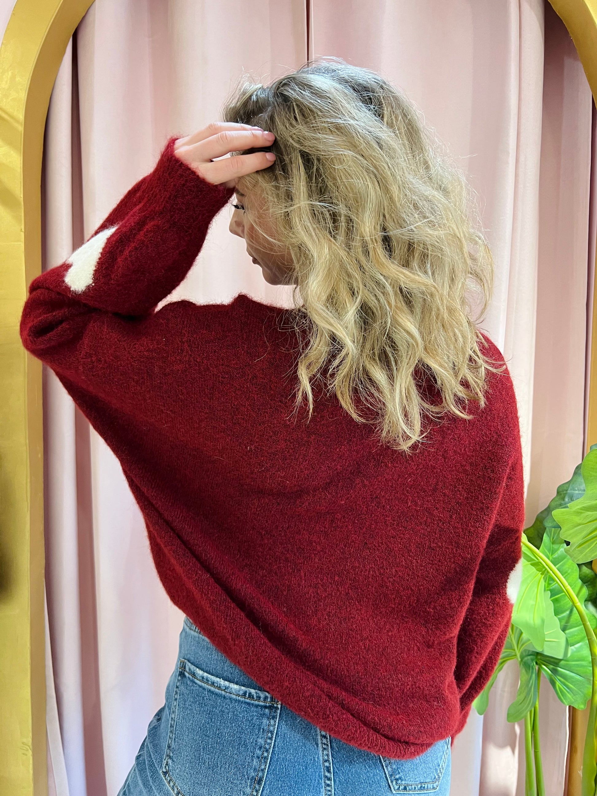 Les cœurs contrastants ajoutent une touche tendre et stylée sans tomber dans le cliché — bref, le pull “good vibes” par excellence.
