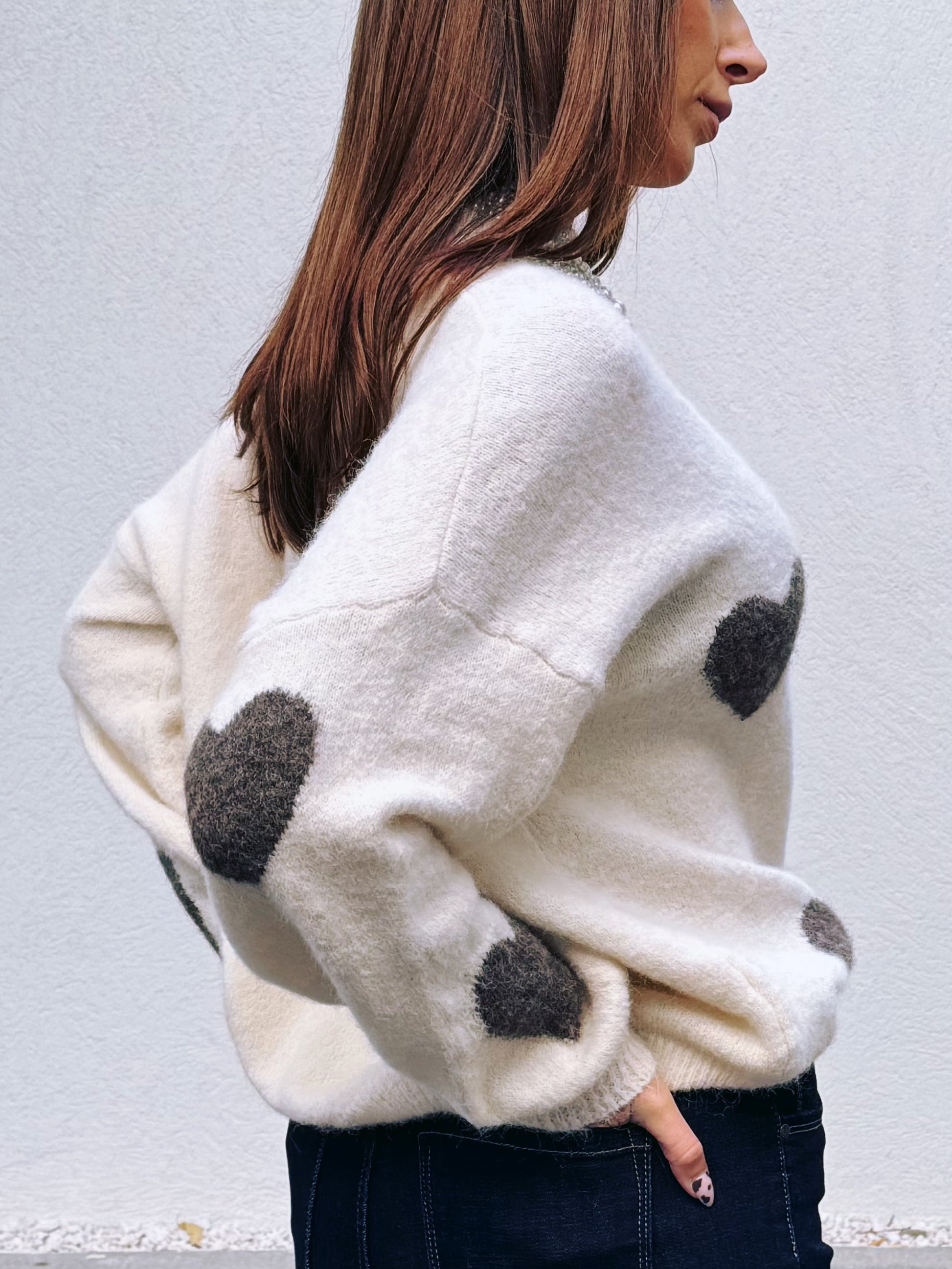 Les cœurs contrastants ajoutent une touche tendre et stylée sans tomber dans le cliché — bref, le pull “good vibes” par excellence.
