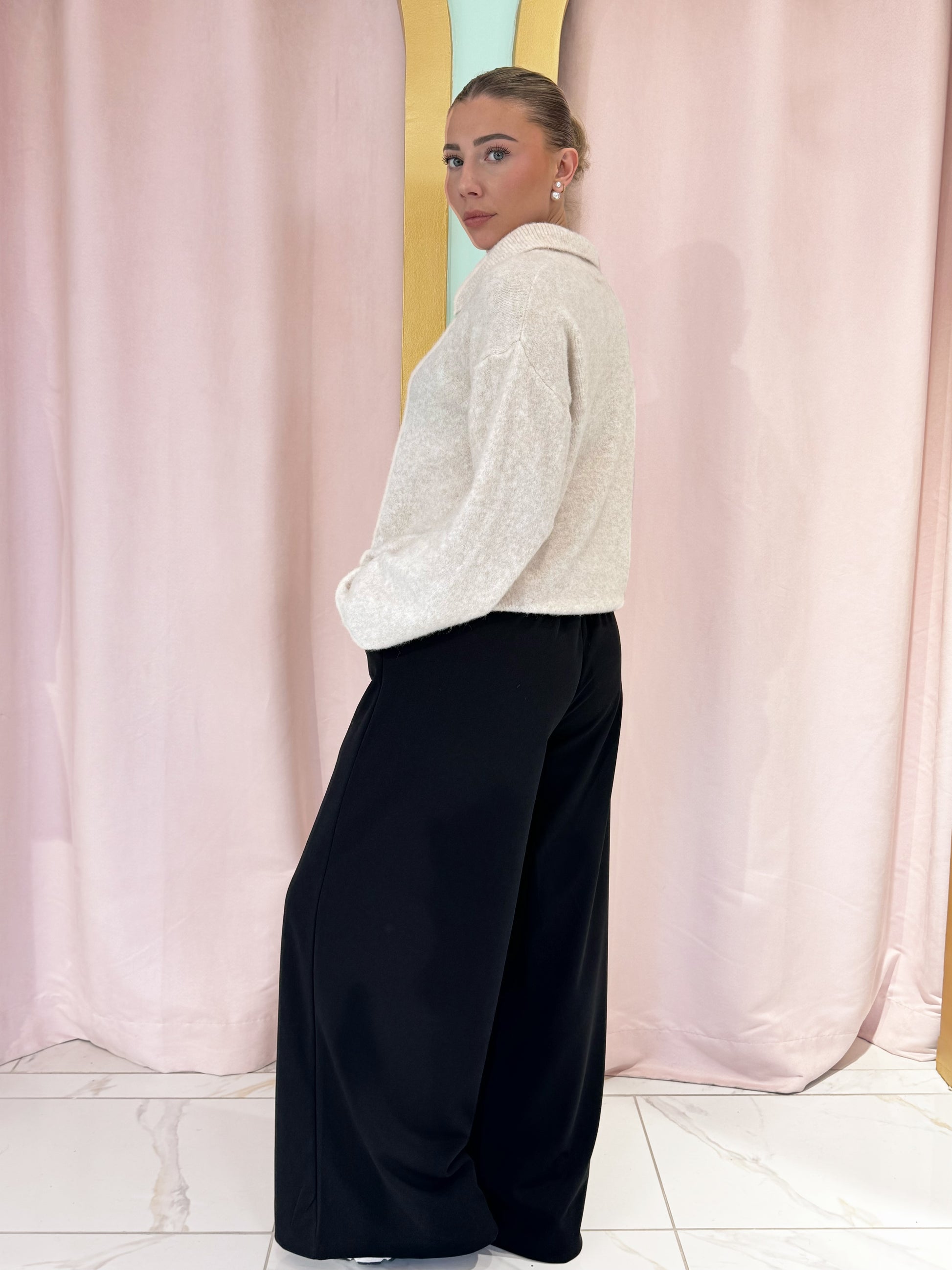 Le pull maille loose absolument irrésistible pour un look clean, moderne et ultra cocooning. Son col polo apporte une touche élégante tout en gardant un esprit décontracté, et sa coupe légèrement oversize crée une silhouette effortless ultra tendance.
