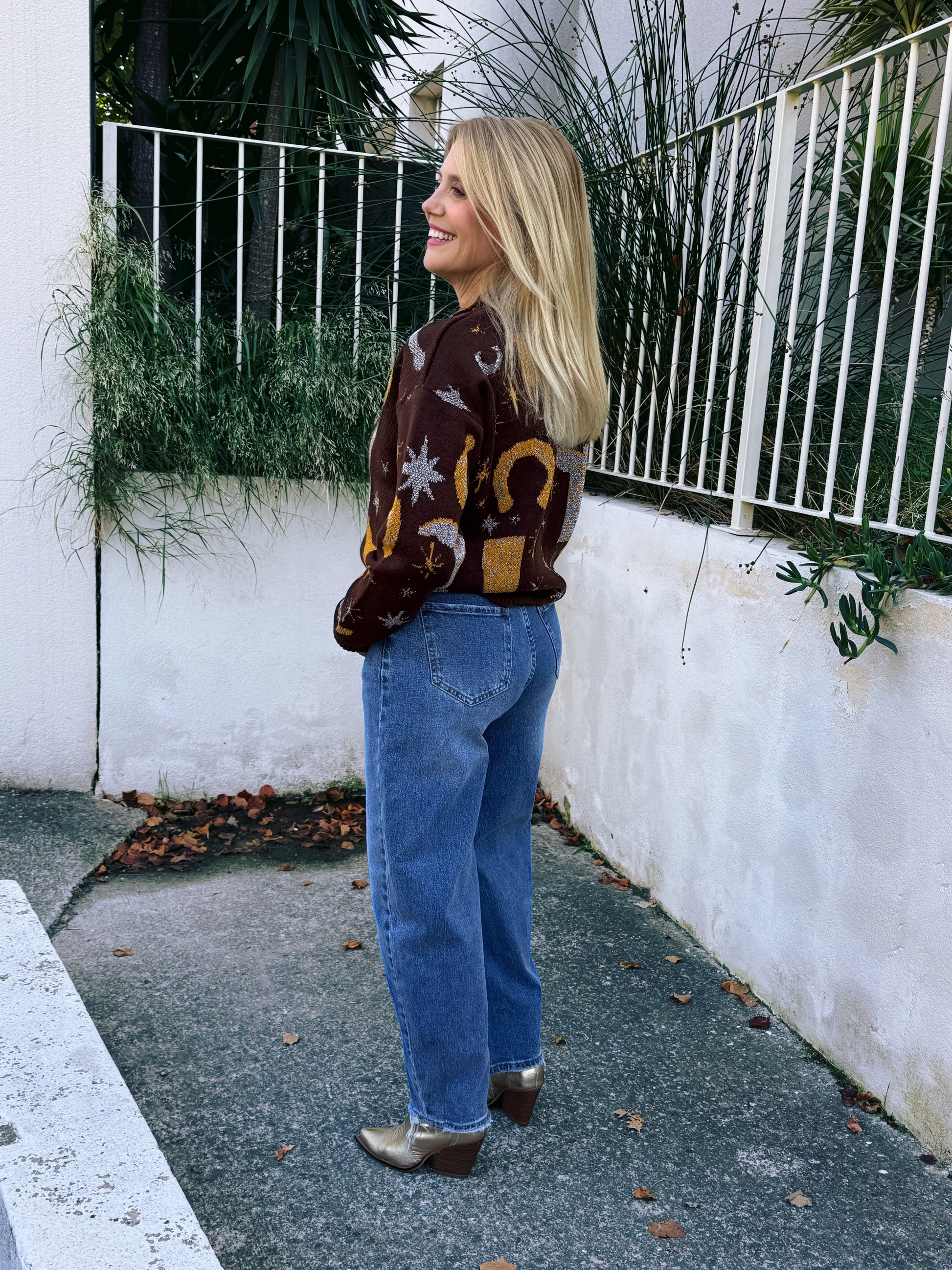 • Motifs iconiques : Des fers à cheval, des santiags et des étoiles, sublimés par des détails en lurex argenté, apportent une touche lumineuse et authentique.