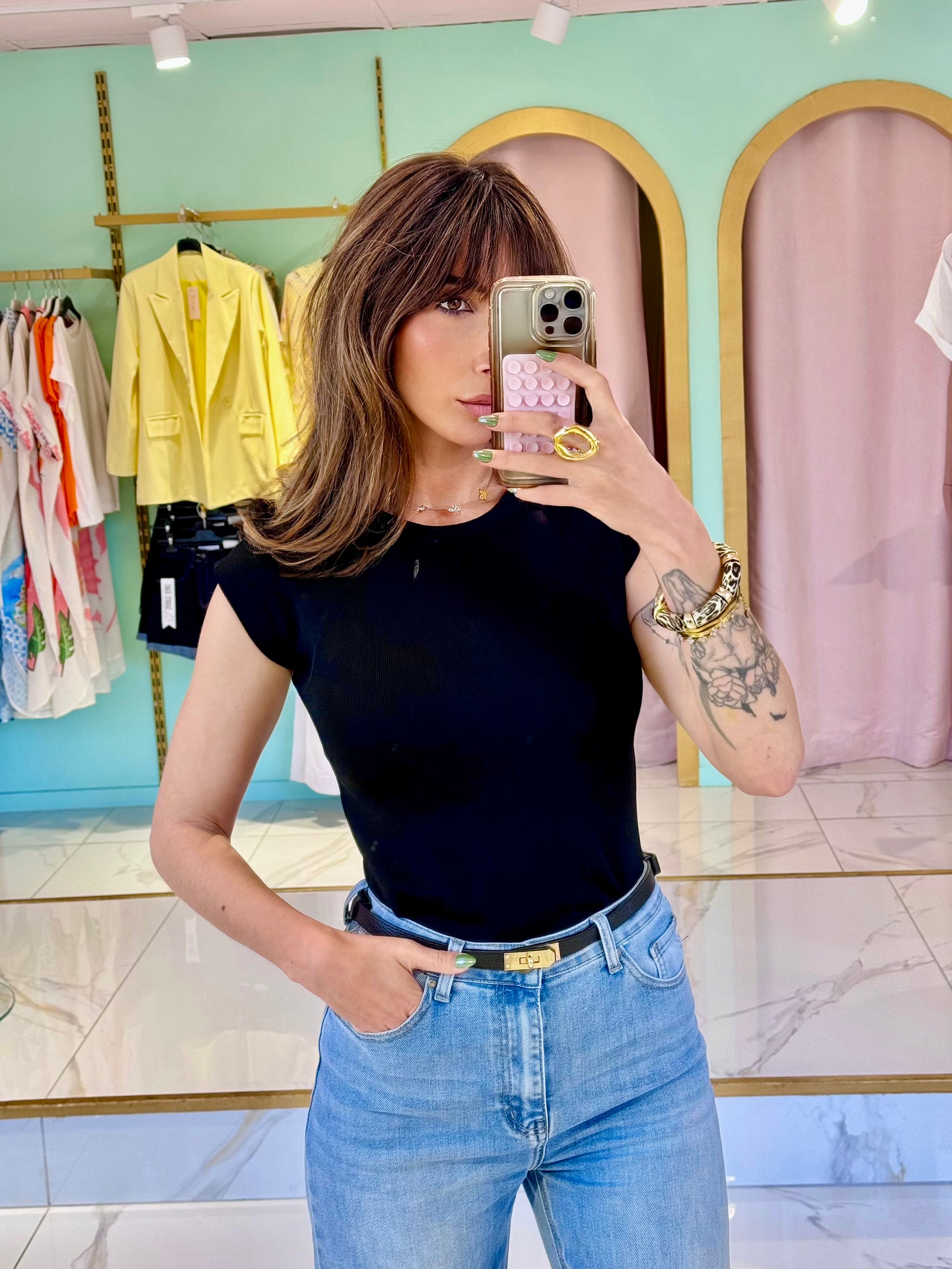 - Rentré dans un jean taille haute pour un effet body canon