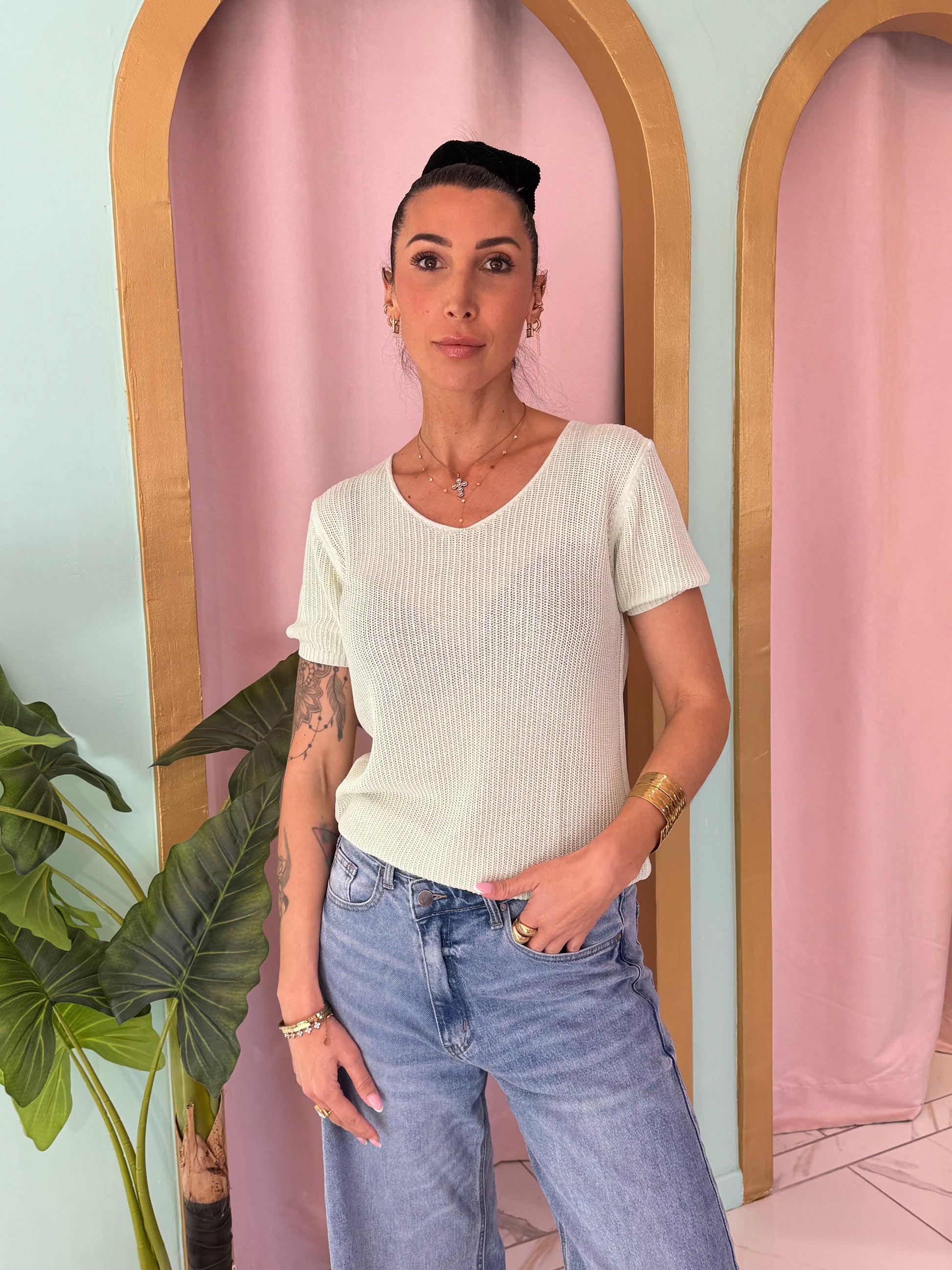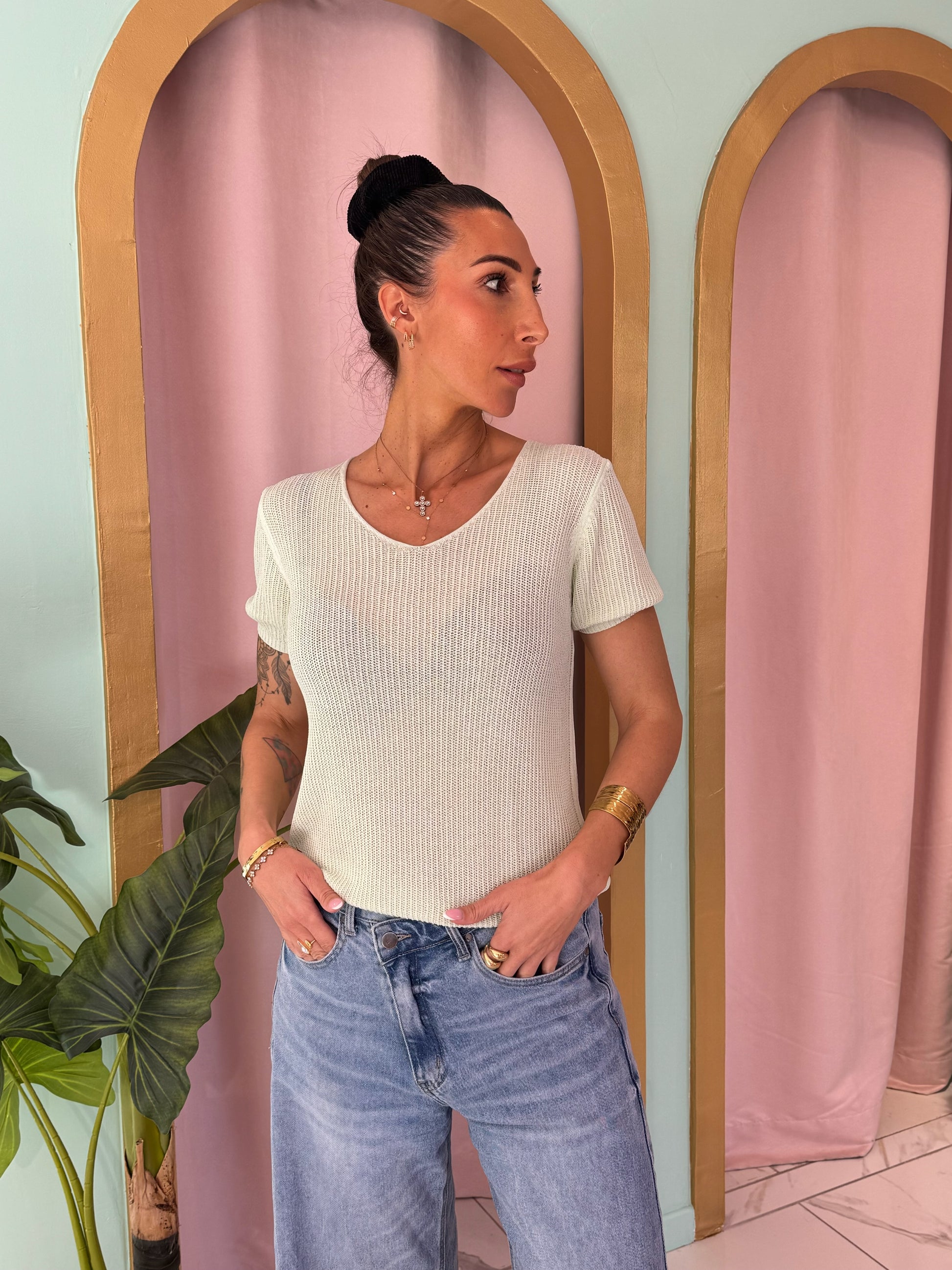 Son col V délicat vient subtilement dégager le décolleté et allonger la silhouette, tandis que ses manches courtes apportent une touche simple et efficace. Une coupe près du corps juste comme il faut, sans marquer.