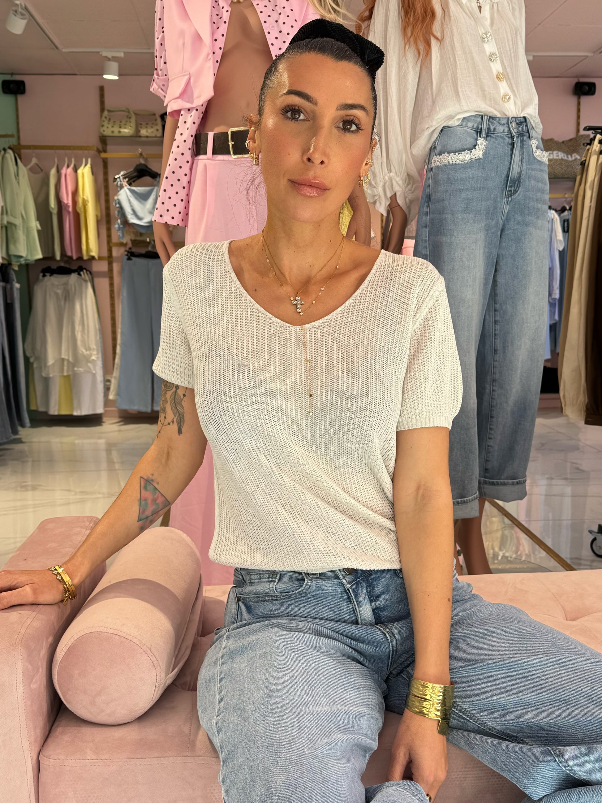 Ce top en maille ultra fine et légère se porte comme une seconde peau : confortable, respirant et idéal pour la mi-saison comme pour les journées plus chaudes.
