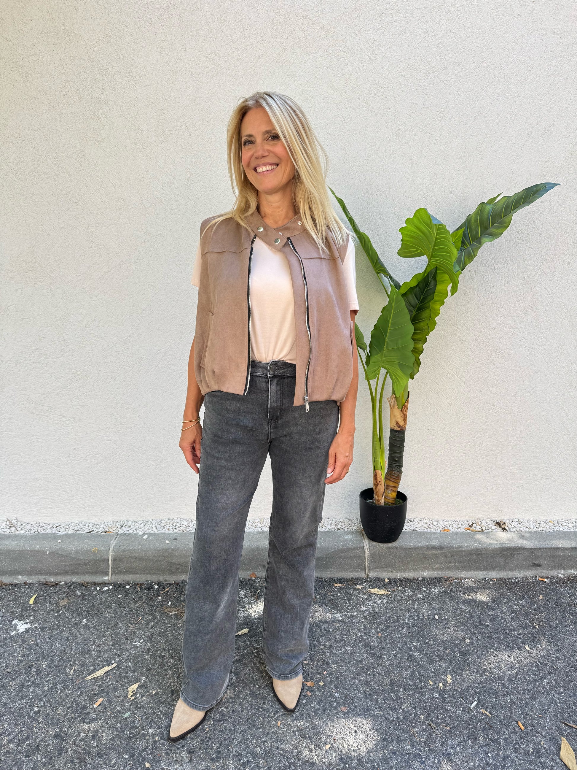 Cette veste sans manches façon nubuck est la pièce qui vient pimper vos looks d’automne. Son toucher ultra doux, son coloris taupe naturel et ses finitions travaillées lui donnent un look à la fois chic et edgy.